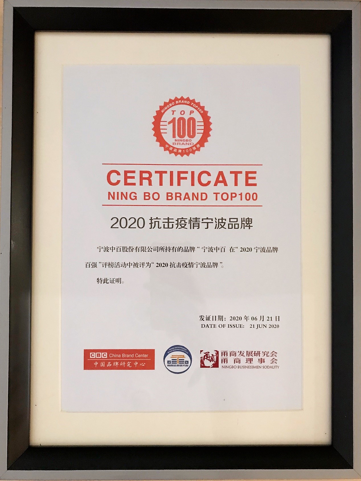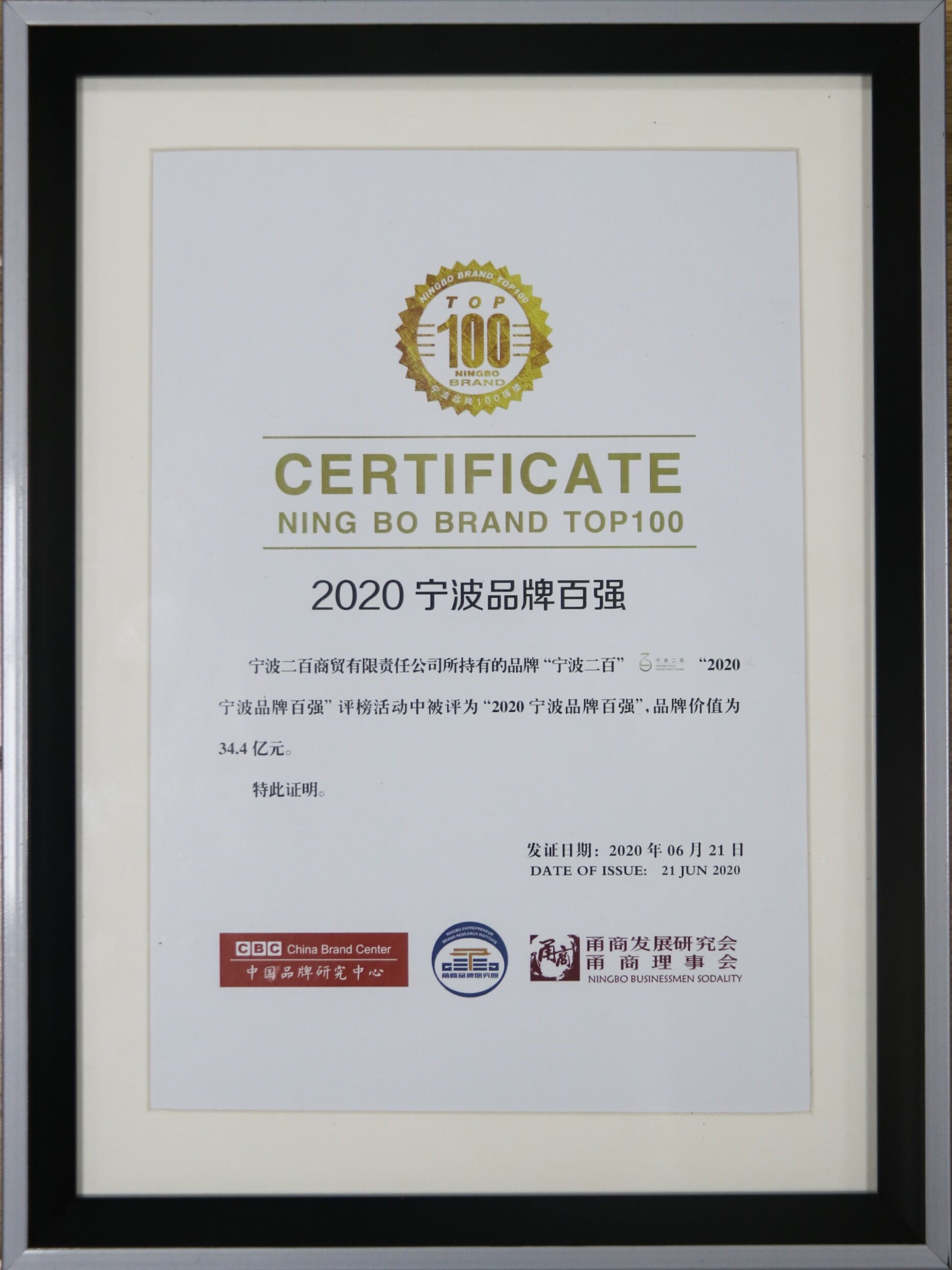 6月21日下午,在由“中國品牌研究中心”、“甬商發(fā)展研究會”、“甬商聯(lián)合會”聯(lián)合舉辦的“2020寧波品牌”授牌儀式上,我公司被授予“2020抗擊疫情寧波品牌”,寧波二百(公司全資子公司)被授予“2020寧波品牌百強”(二百品牌價值為34.4億元)!